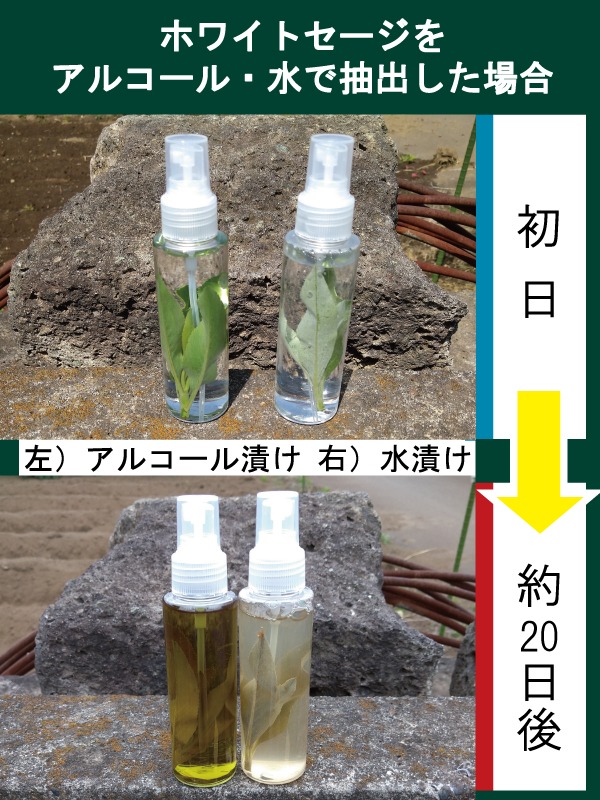 大抵のスプレーが水やアルコール(エタノール)、〇〇エキスなどが使われていて調整されたホワイトセージの香りに。中にはホワイトセージ以外の香りもブレンドされている物もある。実際生のホワイトセージを水とアルコールで抽出してやってみたけどアルコールのニオイはするし、色も濁っていく。(下の画像がそのときのもの)