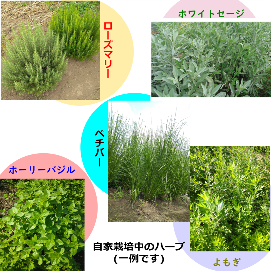 ハーブ(ホワイトセージ、ホーリーバジル、ローズマリー、ベチバー、よもぎ、紫蘇)は自家栽培した物のみを使い、くろもじと檜は国産の物を使って丁寧に蒸留しております。
