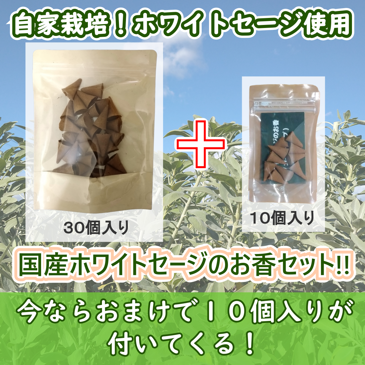 希少な国産オーガニックホワイトセージを使った浄化用コーンタイプのお香です。 今回は特別にお徳用30個入りをご購入いただいた方に10個入りをプレゼント!