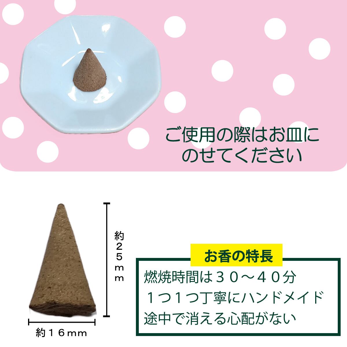 【使用方法】 ・三角錐の先端に火をつけてご使用してください。 ・ご使用の際はお皿やお香皿、香炉、灰皿など火や熱に強い物に乗せてください。 【使用上の注意】 ・この商品は食べ物ではございません。お子様の口に入らないようご注意ください。 ・火の取り扱いには十分注意してください。 ・ご使用中はその場を離れず、目を離さないでください。 ・心身に異常を感じた場合は使用を中止し、十分に換気を行ってください。 ・お香の用途以外は使用しないでください。