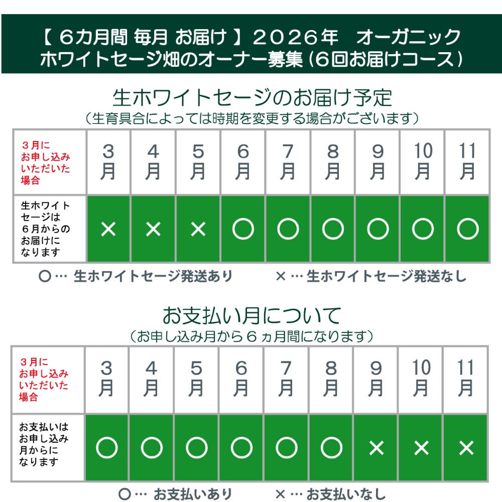 【 ホワイトセージ畑 オーナー募集 内容 】 1 ホワイトセージ畑のオーナー期間は2026年5月~2026年11月までになります。 お支払いは月々2700円 × 6回払いです。 2 期間中に収穫したホワイトセージを6回(1回あたり300g)送料無料でお届け致します。 3 草むしりや害虫対策など日々の栽培・管理は一切不要です。私どもが行います。 4 月2回メールで成長具合や発送連絡をご報告いたします。